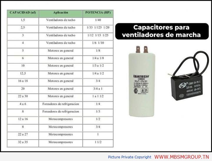 في القسم الأوسط من الجدول تُصنَّف مكثفات التشغيل الخاصة «بالموتورات عامة»؛ وهي المحركات التي تدير مراوح دفع الهواء، أو مضخات صغيرة، أو أجهزة بسيطة أخرى، حيث تتدرج القيم من نحو 6 إلى 20 ميكروفاراد مع قدرات من 1/4 حتى 1 حصان تقريباً. هنا يبرز دور الفني في اختيار مكثف بسعة تناسب قدرة المحرك دون مبالغة، لأن زيادة السعة عن المطلوب ترفع تيار التشغيل وتزيد سخونة الملفات، بينما يقلل اختيار سعة أقل من اللازم من عزم الإقلاع ويجعل المحرك يئن أو لا يقلع نهائياً.