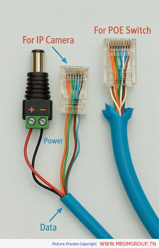 تعتمد الفكرة على استغلال بعض أزواج الأسلاك داخل كابل الإيثرنت لنقل الجهد المستمر، في حين تتولى الأزواج الأخرى نقل البيانات، سواء في أنظمة PoE القياسية التي تتبع معايير 802.3 أو في الحلول السلبية التي توزع الجهد بشكل يدوي عبر موصلات جاهزة. في الصورة يتضح أن زوجي الأسلاك الملوّنين يتم سحبهما إلى طرف الطاقة، حيث يثبتان في قابس DC مكتوب عليه قطبية + و‑، بينما تستمر باقي الأزواج إلى فيشة RJ45 الموصولة بمنفذ الشبكة في الكاميرا.