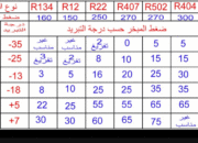جدول ضغط المبخر حسب درجة التبريد بالpsi
